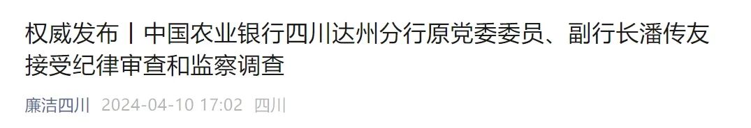 据“廉洁四川”微信公众号消息,中国农业银行四川达州分行原党委委员、副行长潘传友涉嫌严重违纪违法,目前中国农业银行四川分行纪委正对其进行纪律审查,经达州市监委指定宣汉县监委管辖,宣汉县监委正对其进行监察调查。