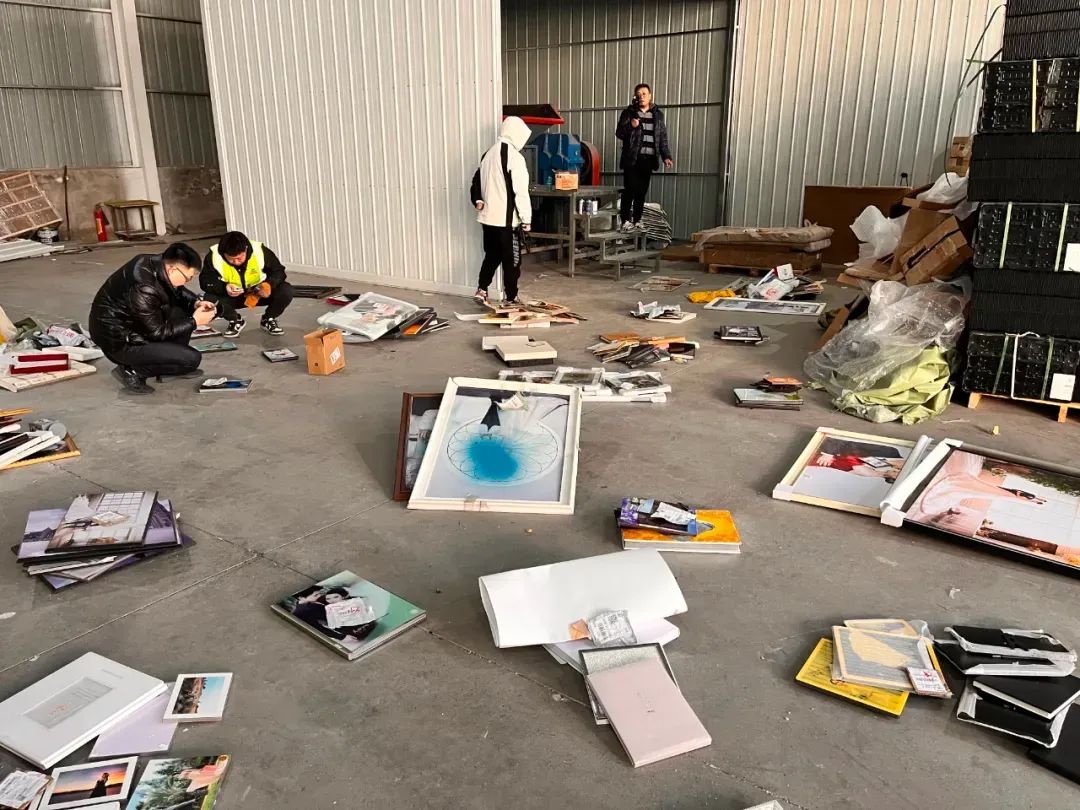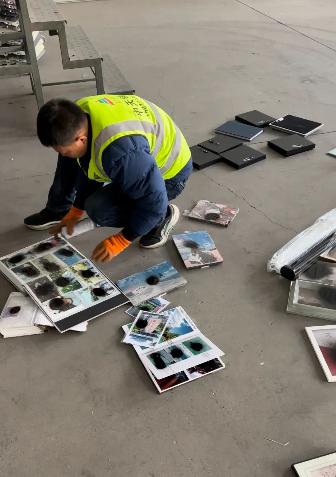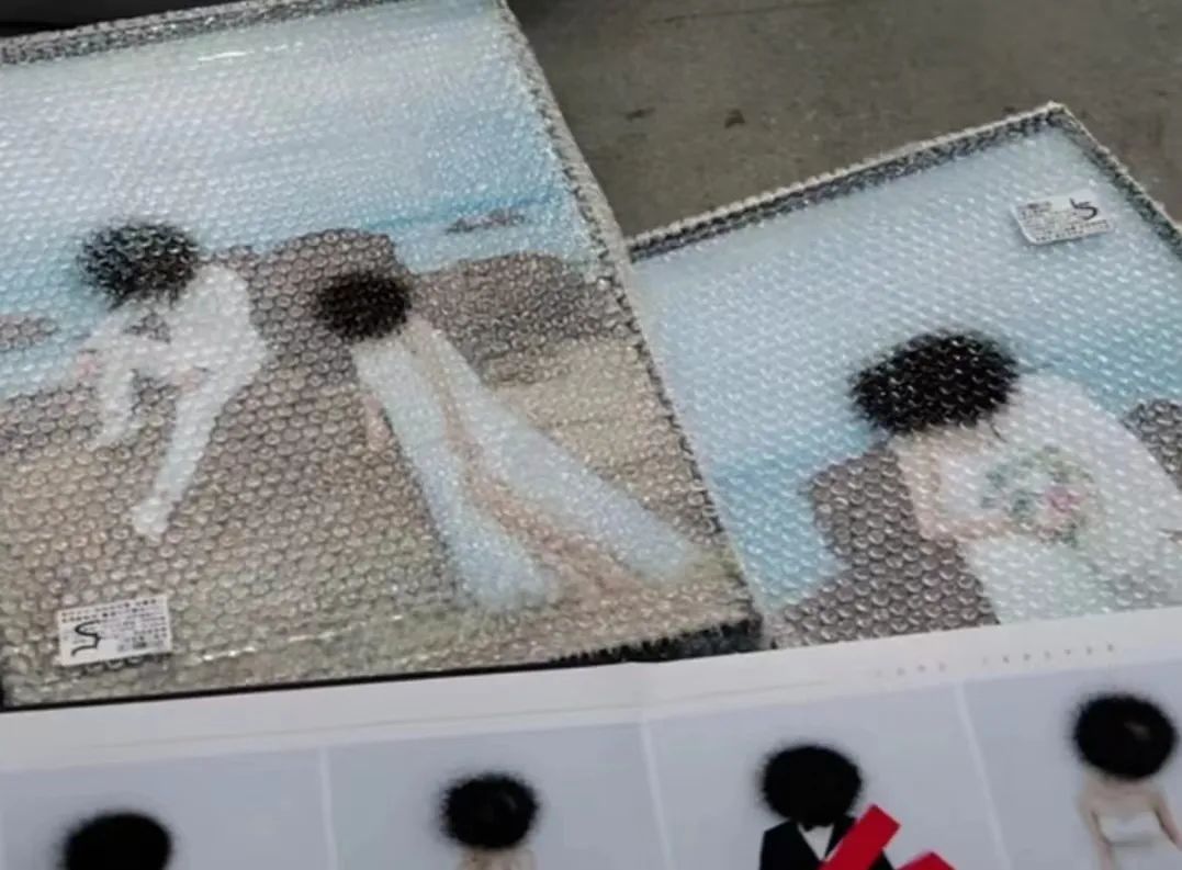 刘玮巨幅沉重的婚纱照、比书本还厚的亚克力相册、裹着塑封的摆台,偌大的照片很快铺满了二三十平方米的空地。