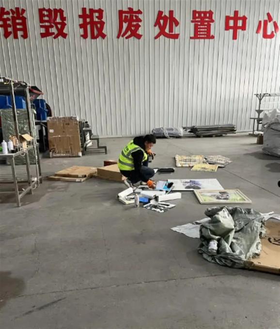 有些照片是用钢化玻璃压制的,得先用锤子砸,再把碎片掰开来放好。粉碎机处理不了,都要放到200吨体量的液压机下销毁。