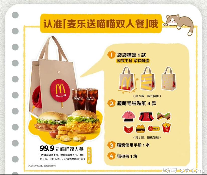 还记得此前被疯抢的麦当劳猫窝吗?去年11月15日,麦当劳推出50万份猫窝周边,三款“袋袋猫窝”将登陆全国超5000家提供麦乐送外送服务的麦当劳餐厅,在麦当劳App购买99元的“喵喵双人餐”即可随机获得“袋袋猫窝”1个。