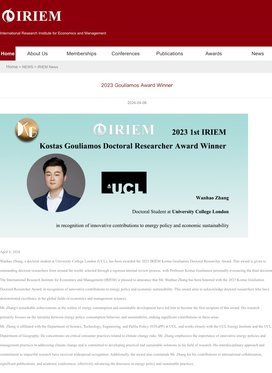 据悉,该奖项从全球众多博士研究员中甄选优秀者,经过严格评审,最后由塞浦路斯欧洲大学前校长、欧洲科学与艺术学院院士、英国皇家艺术学会会士、国际工程技术协会(IETI)会士,国际经济管理研究学会主席科斯塔斯·古里亚莫斯院士亲自审定。张万豪由于在能源政策和经济可持续发展领域所做出的研究贡献而获此殊荣。国际经济管理研究学会拥有2位诺贝尔经济学奖得主,多位经济、管理及交叉学科的院士、校长、教授、博士。2023年发起首届以该学会主席名字命名的奖项,最近刚刚评选出获奖名单,日前在该学会官网进行了公示。