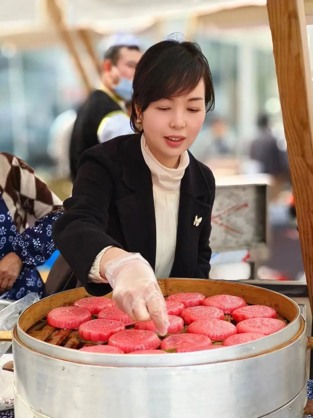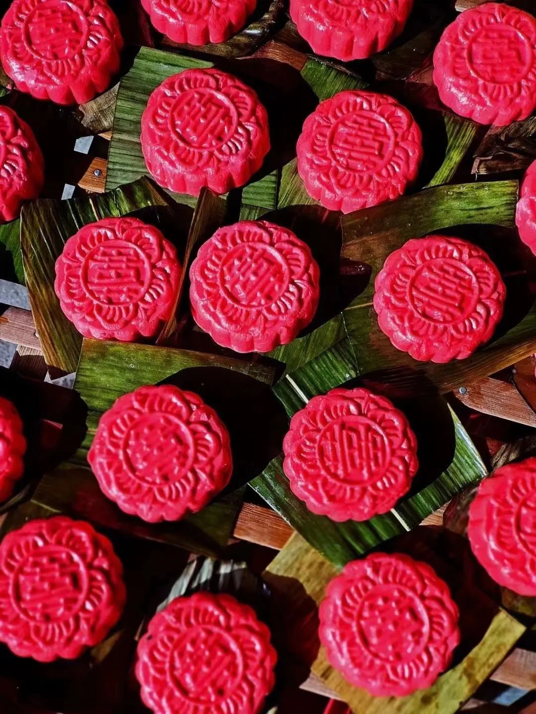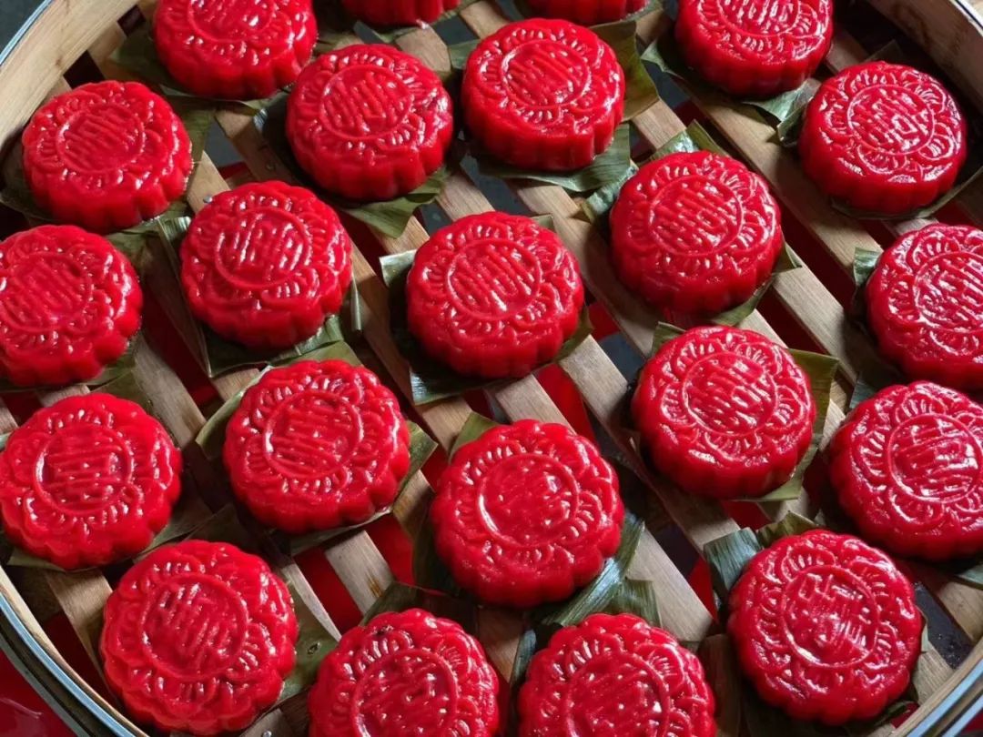 将做好的喜饼用箬叶垫底放入蒸锅,饼与饼之间要留有空隙,避免粘连,随着开水的咕噜声,盖上锅盖,大火蒸15分钟后,一笼红彤彤的诱人喜饼就出炉了。美食打卡:湖山乡樵语湖山农家乐,