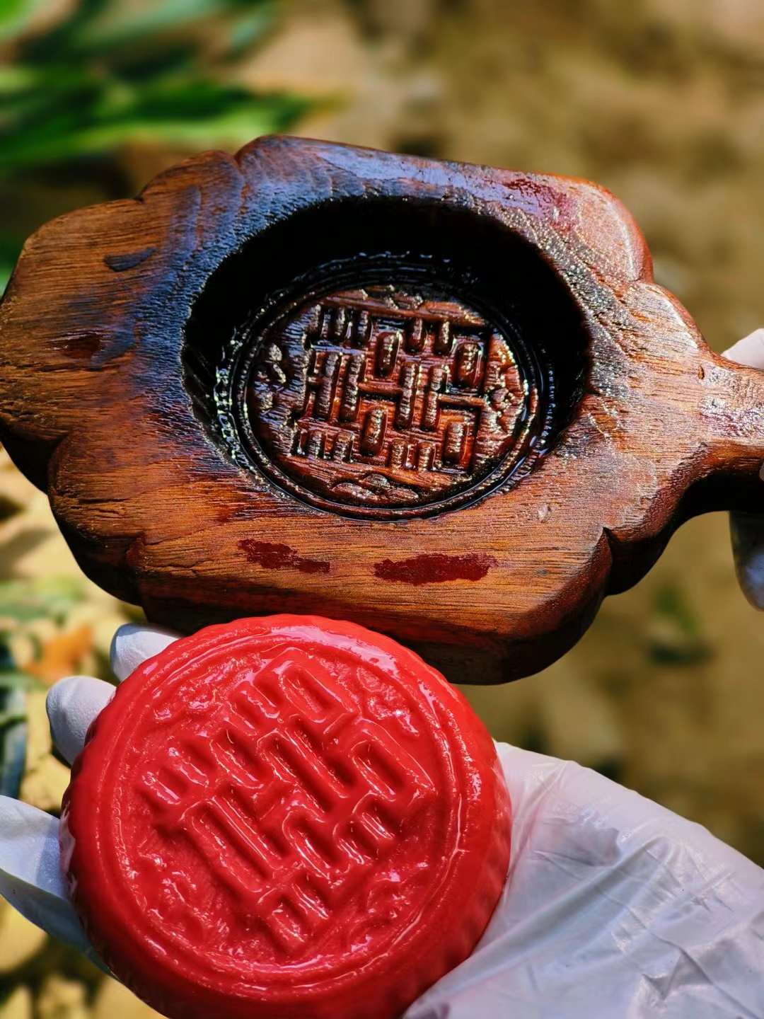 从面团上捏下一小块饼皮, 搓成小圆球,边旋转边揉捏成碗状,再舀起满满一勺混合着芝麻、瘦肉等多种食材的馅料放置饼皮中,用手指捏合收口,将它包裹成模具大小的圆球状。模具上需先刷一点食用油,再将饼皮放入模具中按平,压出花纹,最后倒扣、轻轻一敲 ,一个喜饼就做好了。