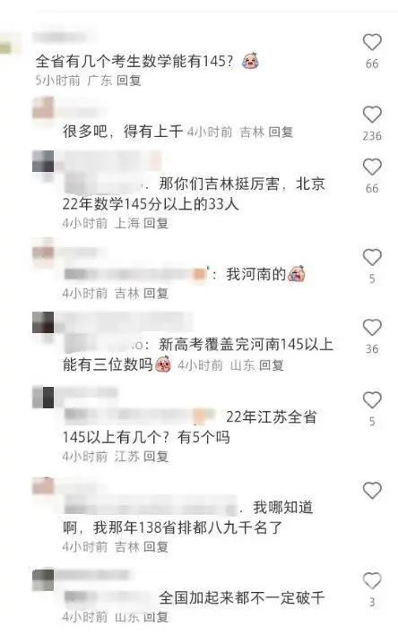 在这个评论下,来自上海、北京、广东、河南等各地网友,争论起“全省有几个考生数学能考145分”。