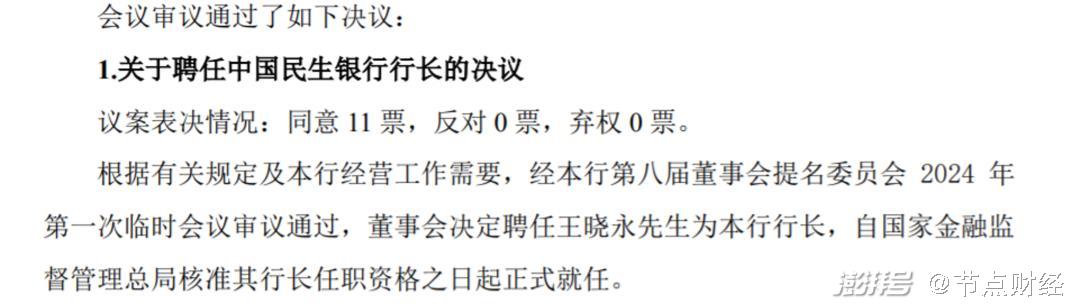 3月12日,民生银行公告称,聘任王晓永为行长,任职资格核准前代为履行行长职责。