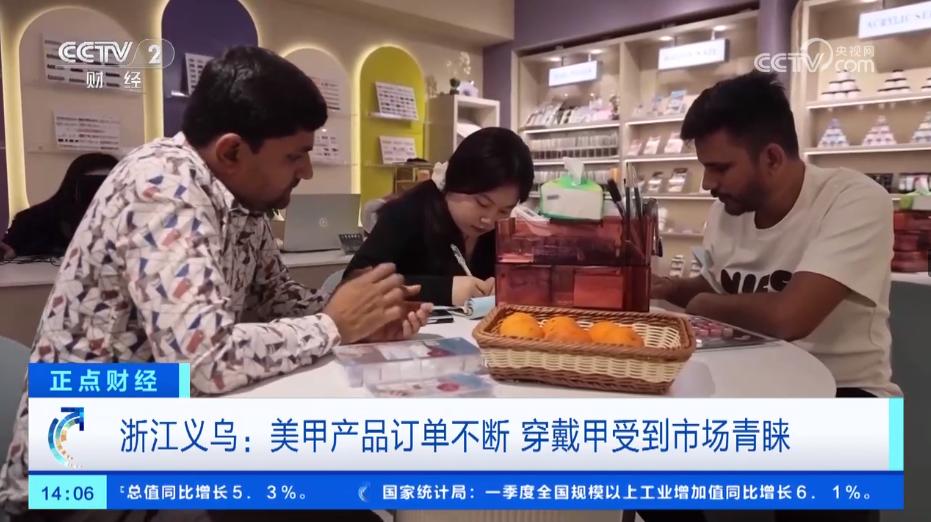 4月16日,央视财经频道《正点财经》栏目播出《浙江义乌:美甲产品订单不断 穿戴甲受到市场青睐》,关注义乌国际商贸城美甲商户订单不断,即穿即撕穿戴甲受到市场青睐。
