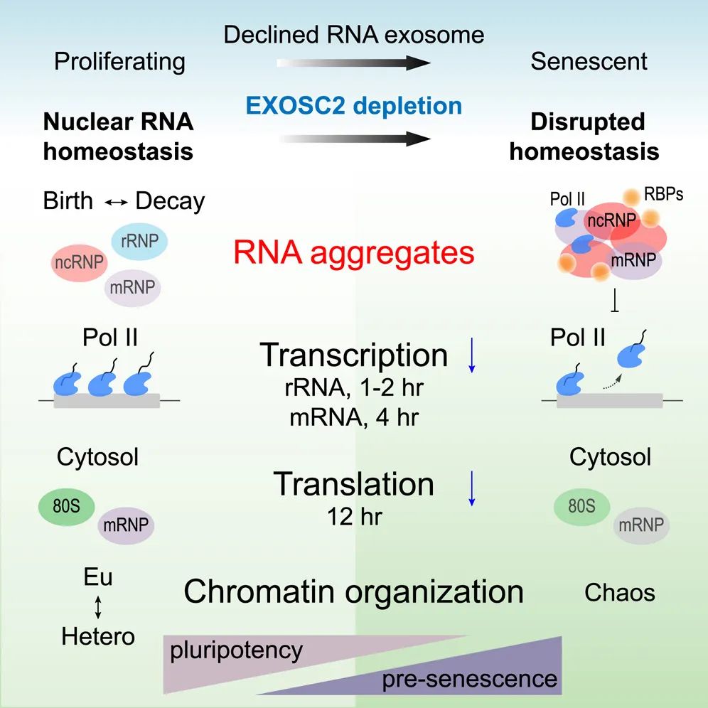该研究表明,细胞核RNA稳态促进细胞命运和衰老的系统性协调,RNA外切体的耗竭导致的核RNA的破坏,会导致系统性功能下降,改变细胞状态并促进衰老。