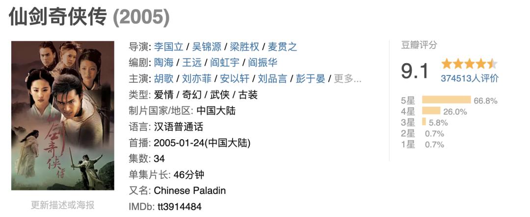 其实吧,《仙剑奇侠传》当初上映时,口碑同样分裂。豆瓣开分7点多,经过多年情怀滤镜才涨到了9.1。