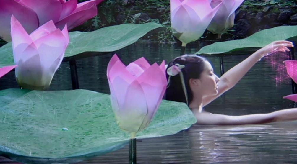 一边是胡歌饰演的李逍遥一脸惊为天人。一边是刘亦菲饰演的赵灵儿在荷花和荷叶中若隐若现。