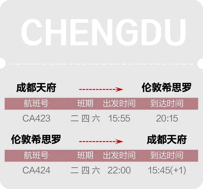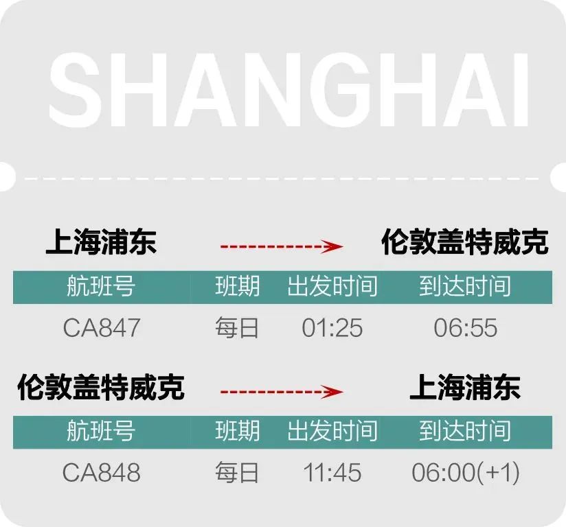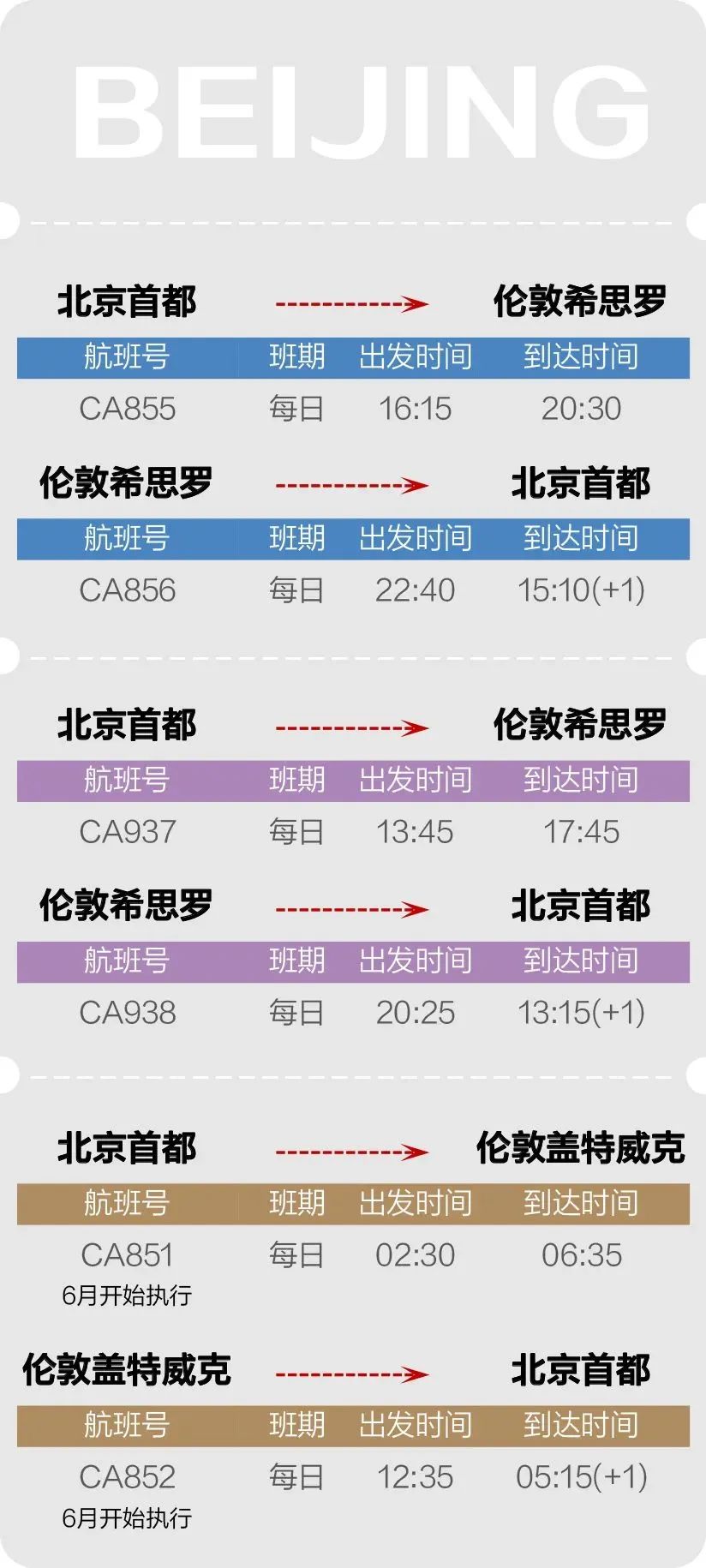 2024年6月1日起,国航中英航线将增班,航班号为CA851/2(北京首都-伦敦盖特威克),班期为每日一班。