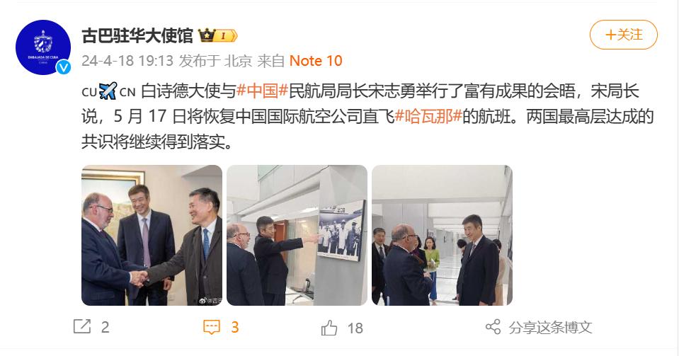 据古巴驻华大使馆消息,5月17日将恢复中国国际航空公司直飞哈瓦那的航班。