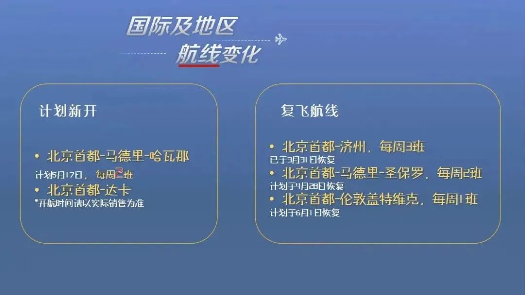 另据国航消息,国航计划于5月17日起新开北京首都=马德里=哈瓦那航线,每周执行两班。