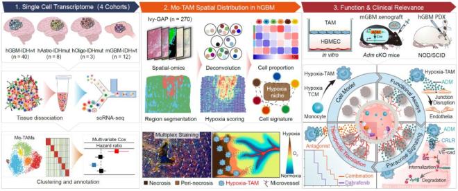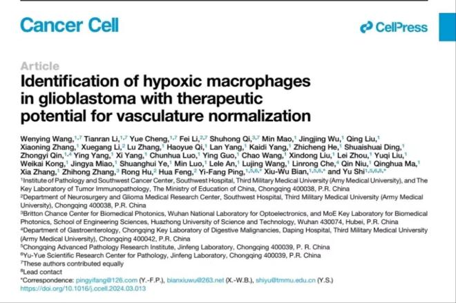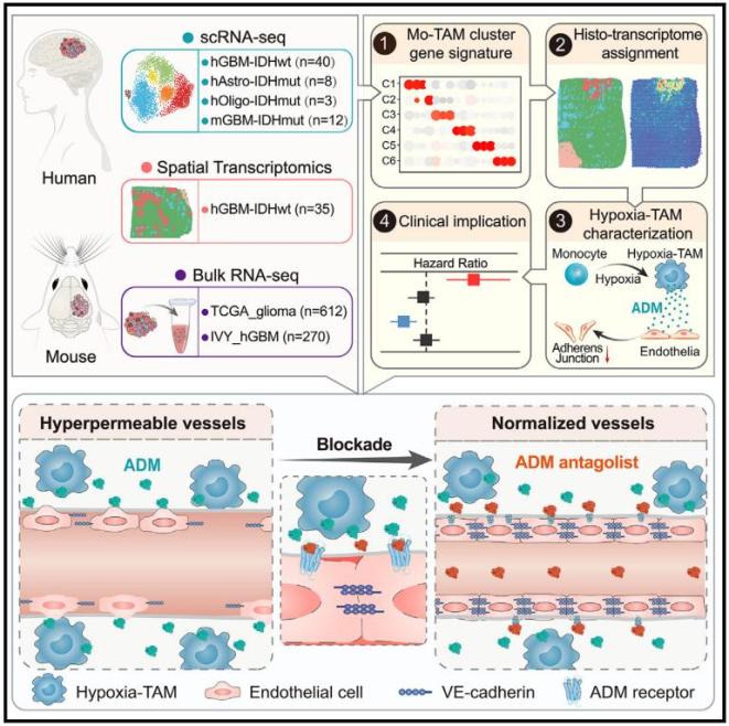 2024年4月18日,陆军军医大学第一附属医院(重庆西南医院)全军临床病理学研究所卞修武院士、时雨副教授、平轶芳教授团队联合陆军军医大学第一附属医院脑胶质瘤医学研究中心、神经外科李飞副教授、华中科技大学武汉光电国家研究中心张智红教授团队的祁淑红副研究员在Cancer Cell上发表了题为Identification of hypoxic macrophages in glioblastoma with therapeutic potential for vasculature normalization的研究论文,系统揭示了恶性胶质瘤内Mo-TAM的转录表型和空间分布异质性特征,鉴定出缺氧坏死微环境内富集的TAM缺氧亚群(Hypoxia-TAM)并证实其诱导微血管渗漏表型,阐明了靶向该亚群对胶质瘤血管正常化和提高抗肿瘤药物递送效率的治疗学意义。