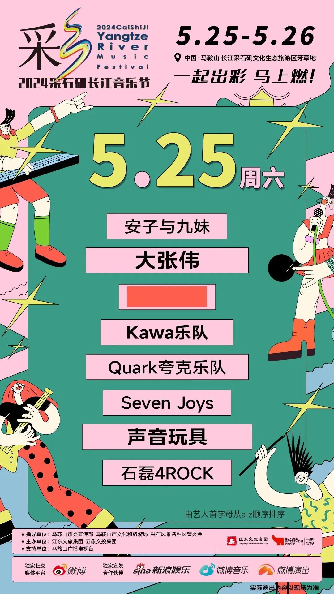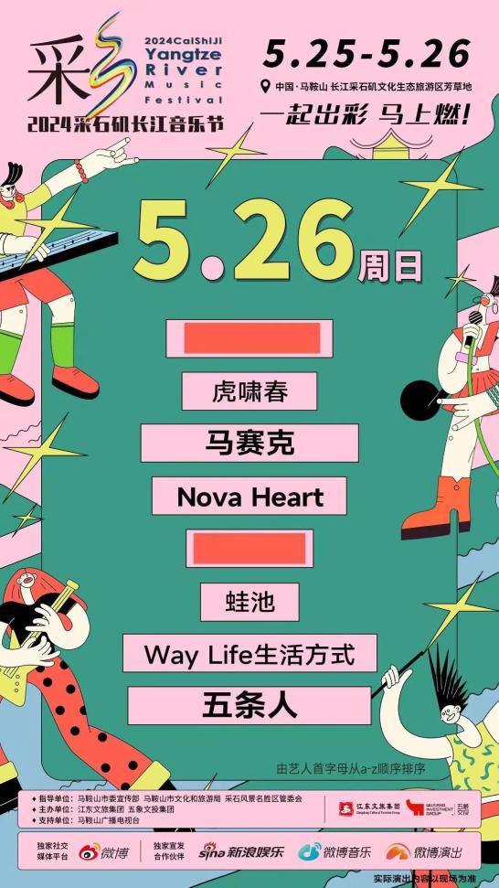 即将于5月25、26日在马鞍山举办的2024采石矶长江音乐节,两天的阵容由大张伟、五条人压轴,在4月18日开票,直接亮出单日188元的价格。音乐节话题不但霸榜安徽本地同城数据,在微博、抖音等社交媒体上也一度进入热榜。