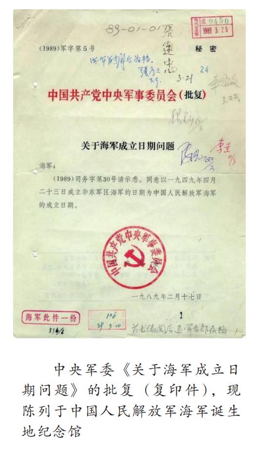 在江苏省泰州市中国人民解放军海军诞生地纪念馆保存的历史资料中,当属“中央军委《关于海军成立日期问题》的批复”最为珍贵。批复全文为:“海军:(1989)司务字第30号请示悉。同意以一九四九年四月二十三日成立华东军区海军的日期为中国人民解放军海军的成立日期。中央军委 一九八九年二月十七日”。这份批复就是中国人民解放军海军的“出生证明”。1946年初,时任华中军区第二副司令员的张爱萍在奔赴津浦路的途中出了意外,由于头部受伤严重,张爱萍被安排到苏联治疗,直到1949年初才从苏联养伤归来。1949年1月,中共中央政治局会议通过的决议《目前形势和党在一九四九年的任务》明确指出:“一九四九年及一九五〇年我们应当争取组成一支能够使用的空军及一支保卫沿海沿江的海军,这种可能性是存在的。”具体任务分工是由第四野战军负责空军筹建,第三野战军负责海军筹建。中央军委的想法是在华东创建一支海军,编制上隶属于华东军区。由于张爱萍刚刚回国还没有担任具体职务,彭德怀提议张爱萍作为华东军区海军司令员的人选,得到了党中央的认同。