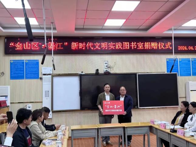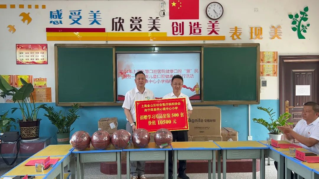 金山区社会组织志愿服务队队长张慧东代表金山区新时代文明实践中心捐赠了爱心图书。在墨江县城小学建立了墨江·金山新时代文明实践图书室。金山区社会医疗机构协会向墨江县城小学捐赠了500套学习文具。上海东慧口腔医院向墨江县城小学捐赠了500套儿童护理套装。