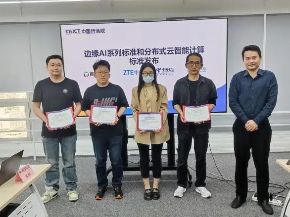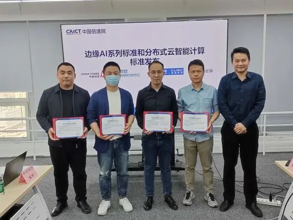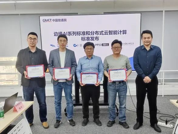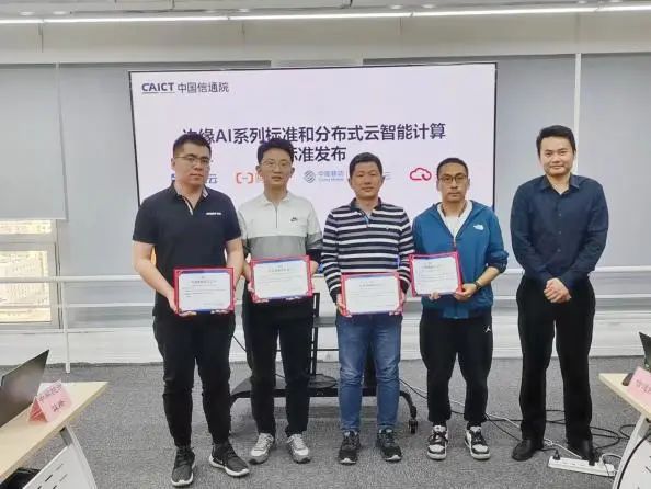 前期,中国信通院联合业界制定分布式云智算平台、边缘AI等系列标准,本次会议中国信通院联合重点参编企业正式发布相关标准。徐恩庆主任为企业代表颁发参编单位证书。
