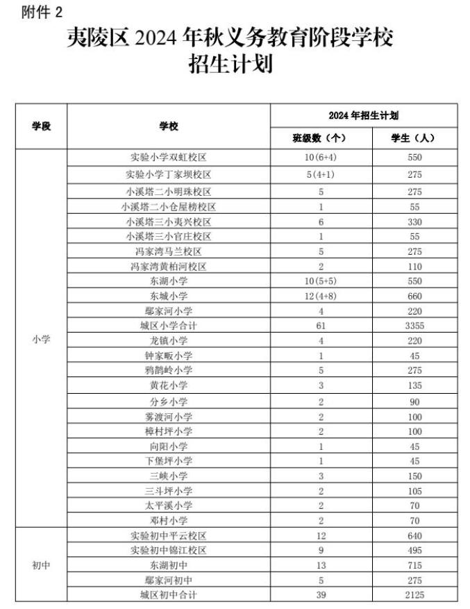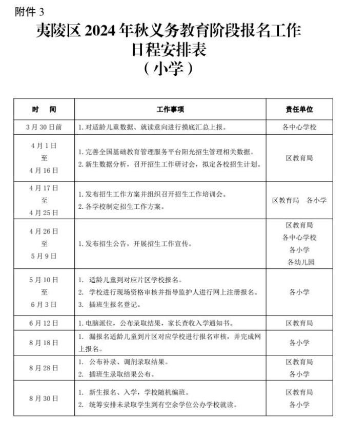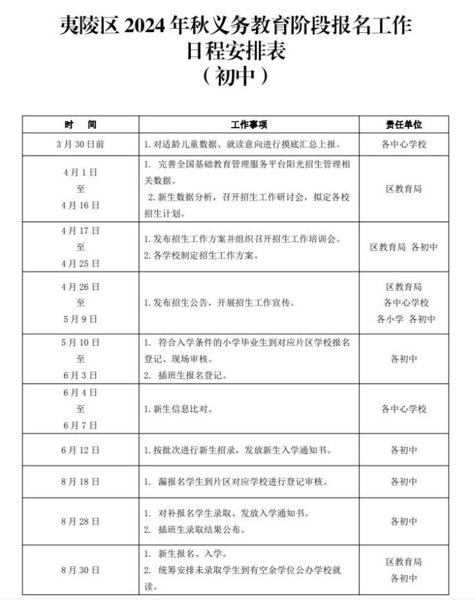 夷陵区2024年秋义务教育阶段招生工作日程安排表