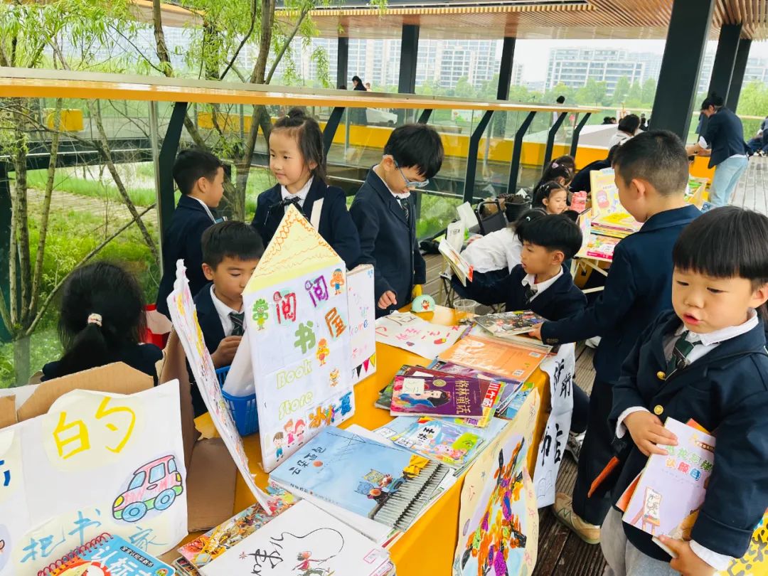 在热闹非凡的童书小跳蚤集市,孩子们在自己的摊位上摆满了商品,童话书、玩具、手工品.....孩子们将平时已经阅读过的童话书收集归纳,拿到集市来售卖,卖出的钱将购置新的书籍存放在班级图书角,以供大家平时分享、阅读。