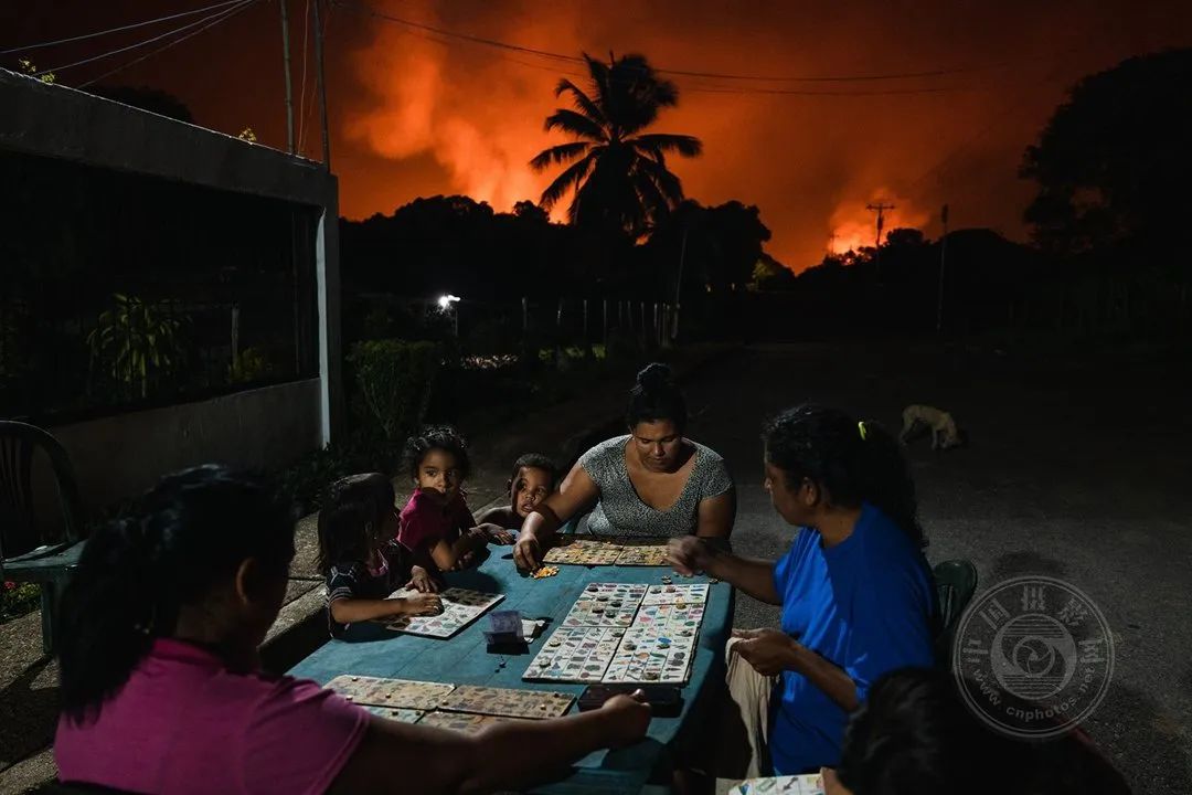 在委内瑞拉马塔角,邻居们在世界最大的天然气燃烧器(用于燃烧油井多余天然气的燃烧烟囱)照亮的天空下玩动物乐透游戏。
