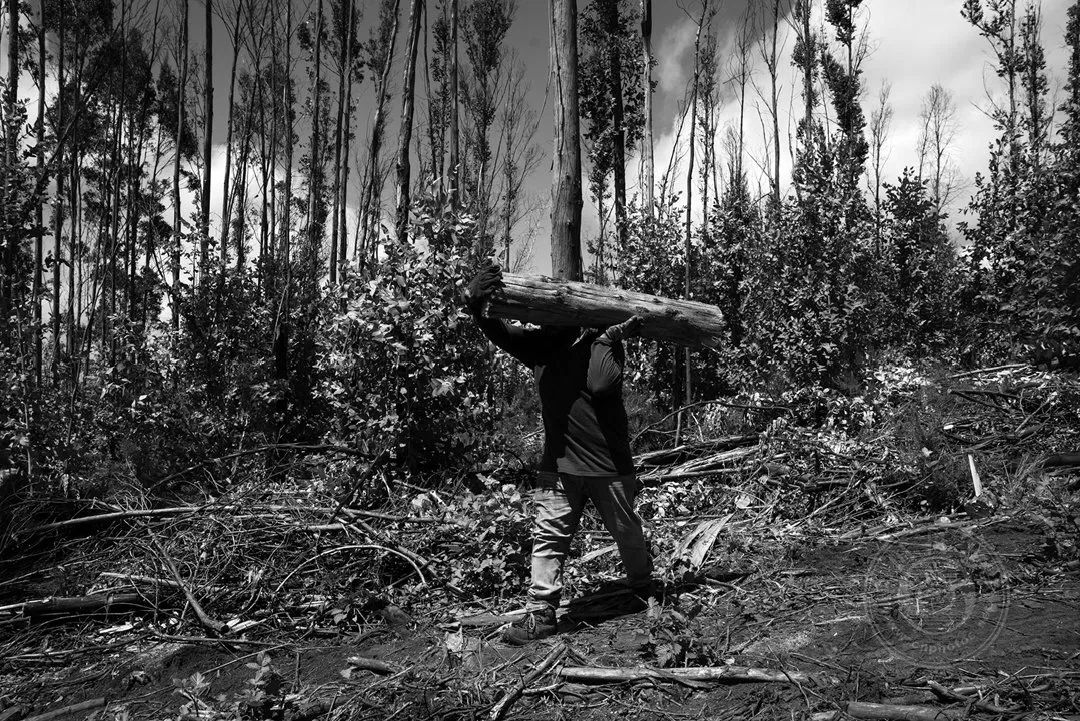 在智利阿劳卡尼亚的派拉胡克,一名年轻的马普切人在搬运桉树原木。收复了林业公司手中土地的社区利用种植的木材建造房屋和烧柴。