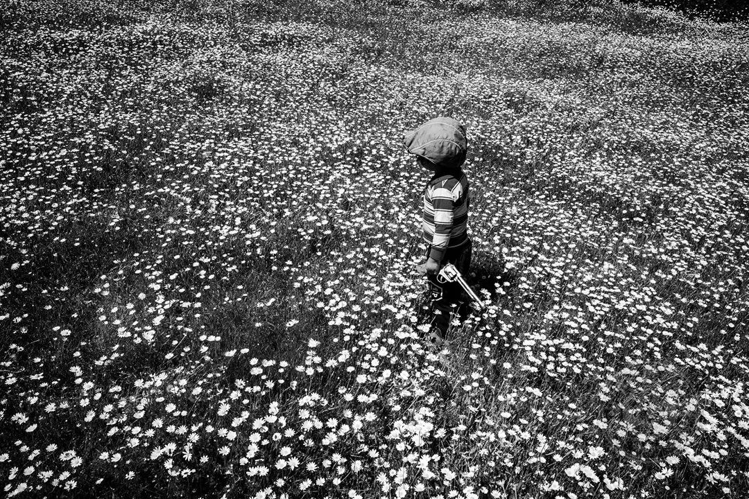 在智利阿劳卡尼亚埃尔西利亚马普切人社区收复的土地上,一个男孩拿着玩具枪走过一片花田。