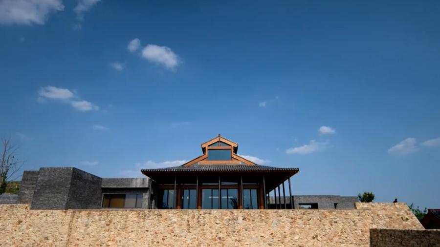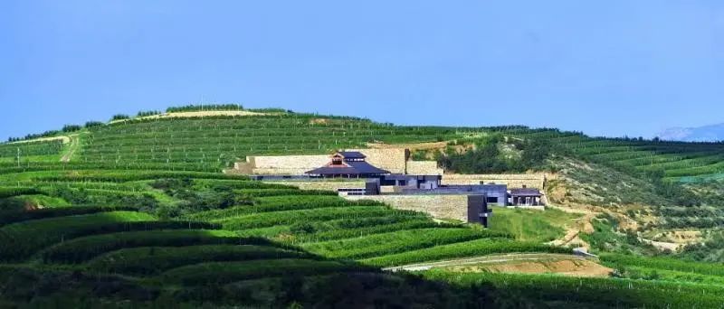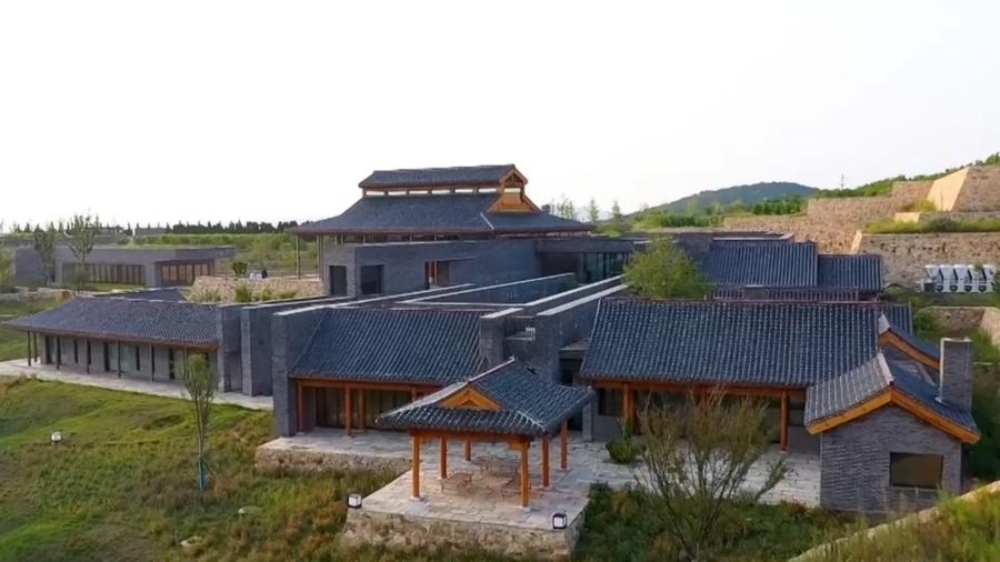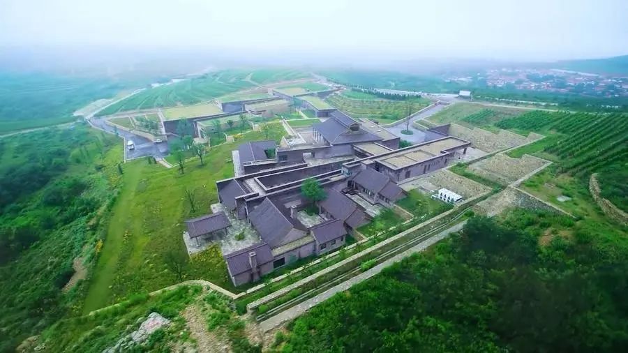站在瓏岱酒庄北侧的环山路向南望,几乎看不见酒庄建筑的身影。而换一个角度,从酒庄南部的谷地向北望,酒庄的身影才隐现于山坡之上,中式建筑与自然融为一体。