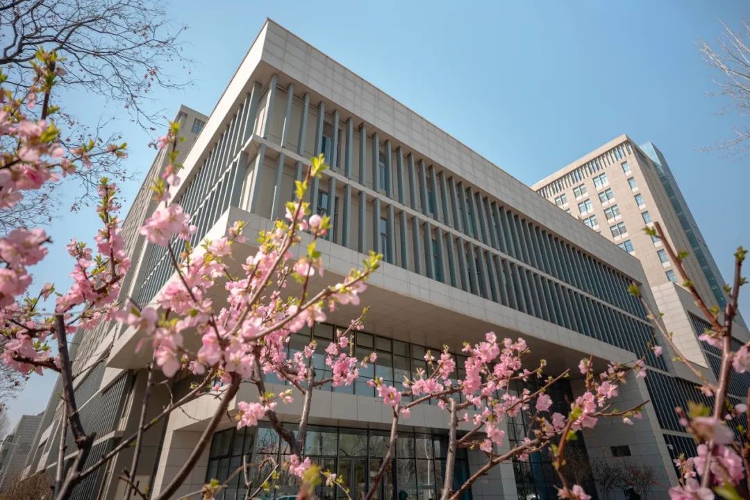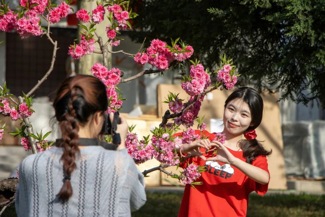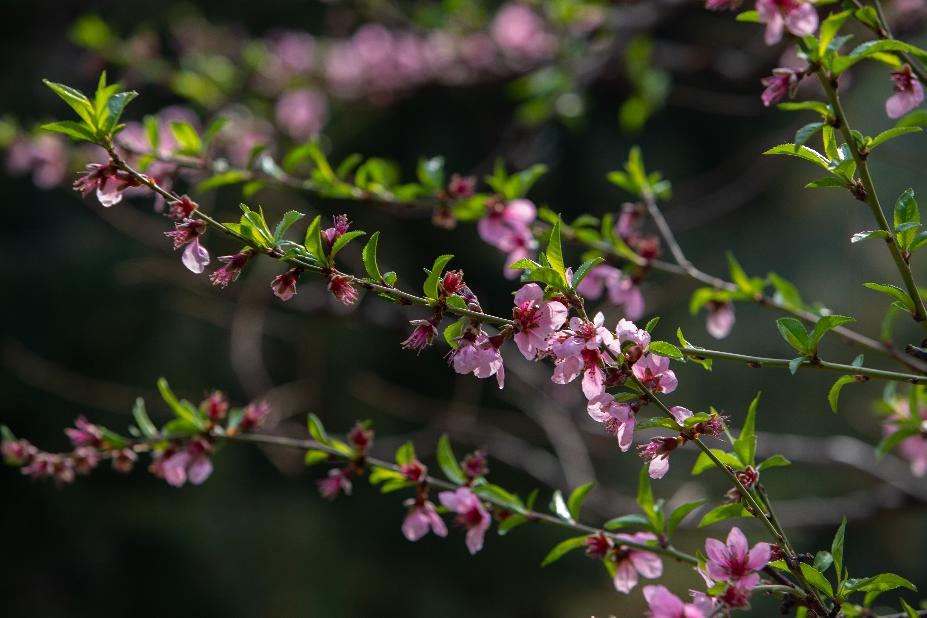 一枝新桃醒春风阳光透过阴云洒在桃花上