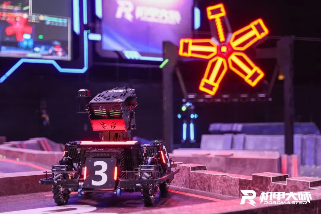 ▲战队成员自主研制的机器人在机甲大师赛现场