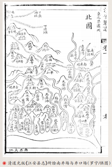 由南井往南十余里即是长江,苏轼、苏辙所说的“南井口”,就是将南井所产的盐运往外地的江边渡口,今名井口。在今南井和长江边的井口之间有一条小河,或称南井河①,流经井口的川安中学之后以及井安桥下,最后汇入长江,在古代它应该就是南井运盐以及其他物资的主要通道。清嘉庆《江安县志》卷2《山川·诸水》有井口三溪,云:“在县东三十里。一出紫云山,一出石峰山,经南井监,一出近岸诸山。三溪相隔里许,盐井出入之处,故名。”现在流经川安中学的南井河,就是“出石峰山,经南井监”的那一条,至于出紫云山的,可能是今名和尚洞河的那条河②,而“出近岸诸山”的,应该是井口场与毗卢寺之间的那条很窄的小溪。明天启年间川南和重庆一带曾发生永宁宣抚使奢崇明的叛乱,叛军劫掠泸州、纳溪、江安等地③,井口士绅百姓集义军,捐资助官军,乱平后陈姓江安县令因当地人之请,将井口改名忠义镇,立《忠义镇碑记》记其事,文云:“余自己未(万历四十七年,公元1619)夏奉命来牧江邑,邑东三十里有井口,余往来泸阳间,常经履其镇,见其横龙枕后,曲水盈前,沙洲铺不尽之毡,石禽锁东流之脉,郁郁葱葱,熙熙攘攘,雄哉江邑一美镇也。自天启元年(1621)九月奢变,兵火摧残,哀哉吾民。……有乡耆孙良杰、侯先春、黄天极、侯启迎等,公呈来禀曰:‘井口镇知有朝廷倡义,杀贼毫不投夷,请更井口之名而另立之’。余曰:‘井口何为而得名也?’众曰:‘南井有盐井,而此镇系买盐者往来之口,今南井报坍,井口之名又安附焉’……尔民亦欣然乐助,共图灭贼,不负纲常,矫矫之性,堂堂之义,耿耿之精,尔镇有之,尔镇之民亦可为忠义矣,故更其名曰忠义镇,俾万世而后,知此镇之民超出寻常万万也。”④从这篇碑文中,除了能看到明天启年间奢崇明叛乱之事及井口改名忠义镇的缘由,也能看到井口之形胜与得名。“沙洲铺不尽之毡”所说的江边沙滩,就是苏辙所写“隐隐沙上立”的地方。忠义之名自此之后至整个清代均沿用,清嘉庆《江安县志》卷1《乡名》载雍正七年(1729)的十乡即有忠义乡,同书卷1《场镇》记场镇二十五,有忠义镇场,“距县二十里,即井口”;有南井场,“距县五十里,界泸州”,与泸州相邻。民国十二年所编《江安县志》卷1《镇乡》记宣统三年(1911)设有一城四镇四乡,“忠义镇在县北,所属三场,曰南井场(中有盐一眼,水淡而枯),曰四面山场,曰井口场(中有董坝)。”新的镇名与老的地名(场名)都在使用。民国十八年(1929)当地设井口乡,1992年设井口镇,2019年井口镇的两个社区(井口社区和川安社区)及9个行政村合并入江安县阳春镇。2020年井口社区和川安社区合并为井安社区。今天井口作为行政区划的名称又一次从历史上消失,但它作为地名还将长久存留。