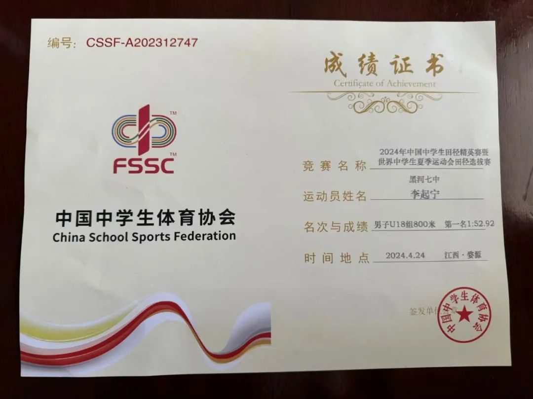 李起宁同学在男子U18组800米项目比赛中表现卓越,以1'52″92的成绩脱颖而出,击败全国众多竞争对手,荣获男子U18组800米全国冠军。