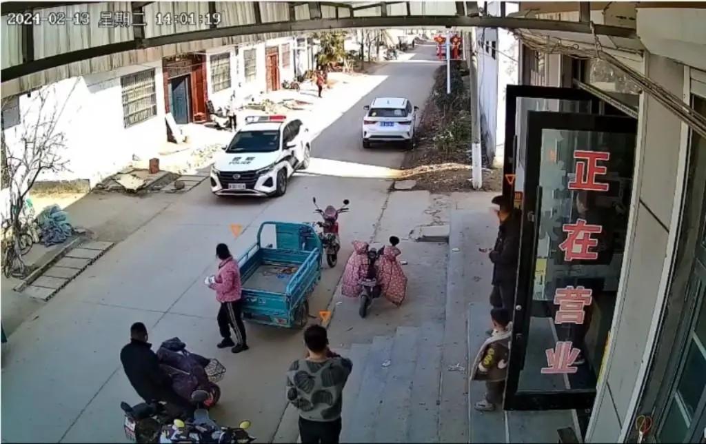 警车开过村子时的视频截图李先生提供的视频显示,高亢的警笛声中,先后有两辆警车驶进视频视野,同时有喊话声传出,仔细辨听,确是类似李先生所描述的喊话内容。警车驶过,可以看到路边群众颇为惊讶的样子,正在营业的店铺内也快速有人走出,随后隐约可听到围观群众的议论声。