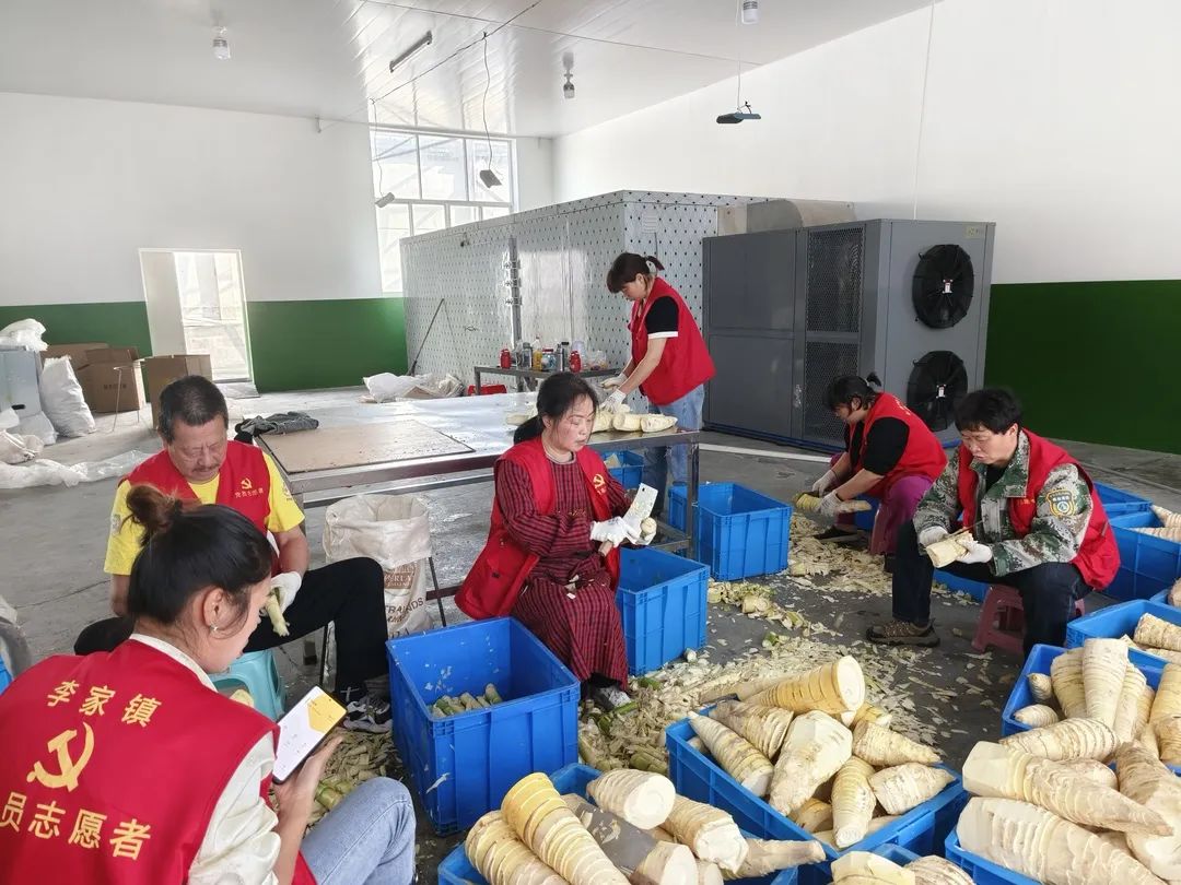 “鲜笋虽鲜,但是不易储存和运输,标准化加工制成笋干后不仅耐储存可待售,也能增加附加值。”作为李家镇唯一的一名女村书记,龙桥村党支部书记杨满花一直思考着巾帼共富之路,于是便找在当地开办坚果加工厂的乡贤王国红沟通,没想到两人一拍即合,决定利用闲置厂房联建共富工坊。