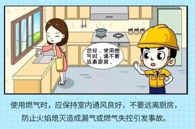 用气不离人,离人不用气。使用后应关闭灶具开关、灶前阀。长时间外出需关闭表前入户总阀。平时勤检查。经常检查室内燃气管道及接头是否漏气,软管连接点是否牢固、有无脱落。注意通风换气。用气时要开窗、开抽油烟机通风换气。灶具符合标准。要使用符合国家标准、具有熄火保护装置的燃气具,超过8年要更换。软管符合标准。要使用不锈钢、波纹管等专用燃具连接软管,严禁使用橡胶软管。软管不能穿越墙体、门窗、顶棚和地面,长度不应大于2米且不应有接头,不能高出灶台。