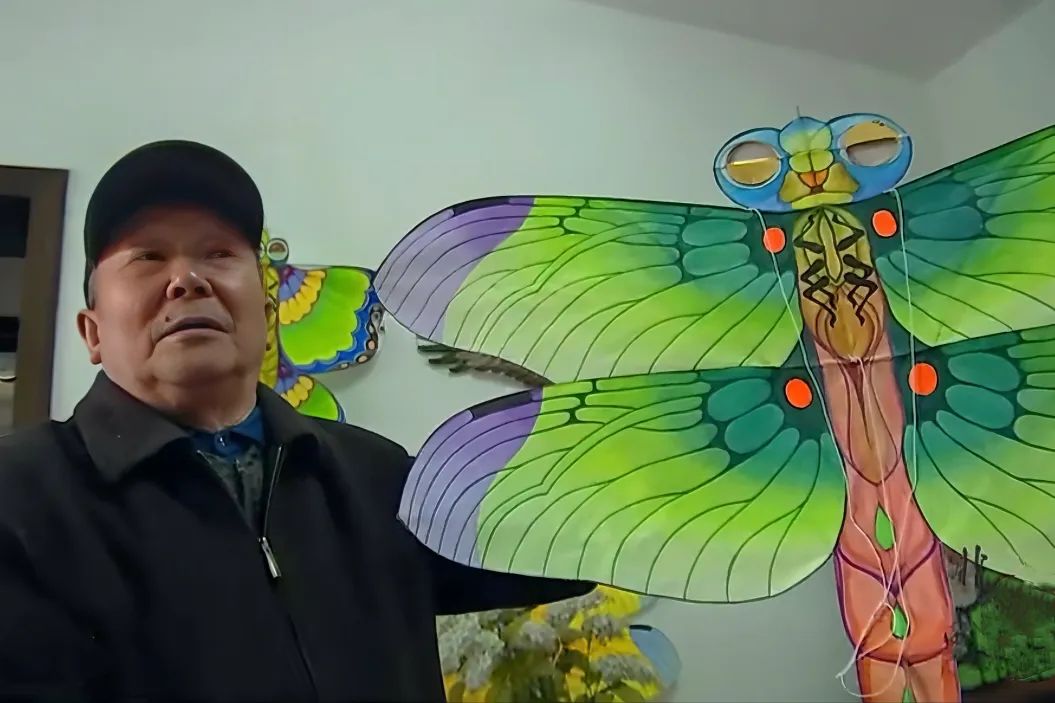 ▲敖平风筝非遗传承人李志凡制作 蜻蜓软翅风筝是我国最为常见,普及度较高的传统风筝之一。此类风筝的升力片由一根主翅条和翅形的蒙面组成,因两翼下部无硬性结构,”随形剪就,而没有’ 骨’ ”,被称为软翅风筝。软翅风筝骨架结构多作成浮雕式,适宜于禽鸟和昆虫风筝。如鹰、蜜蜂、凤凰、蜻蜓、螳螂、蝉等。