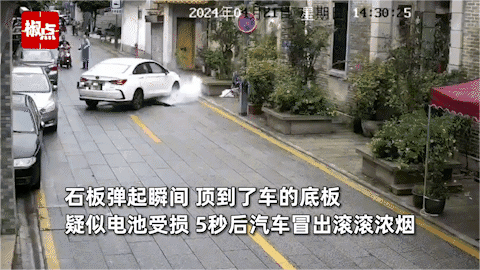 新能源汽车底盘遭碰撞 仅5秒就冒烟