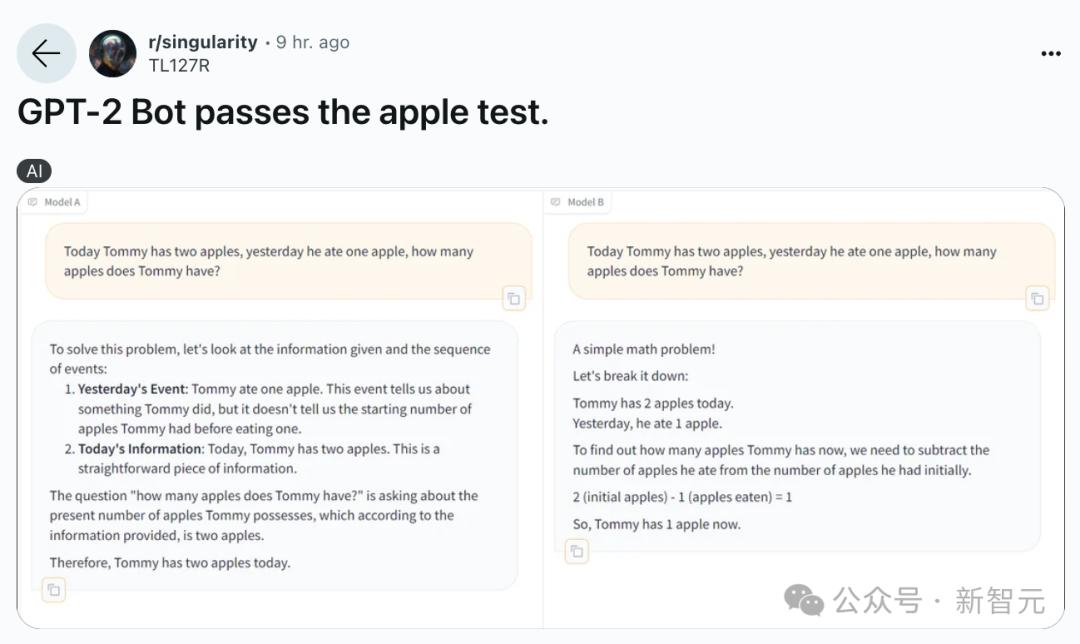 在这个经典的「苹果测试」题中,gpt2-chatbot正确答出了3个苹果。