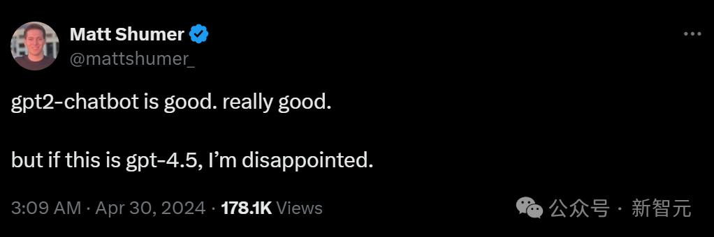 HyperWriteAI CEO Mattt Shumer就表示,虽然gpt2-chatbot很好,但如果这是GPT-4.5,自己就太失望了。