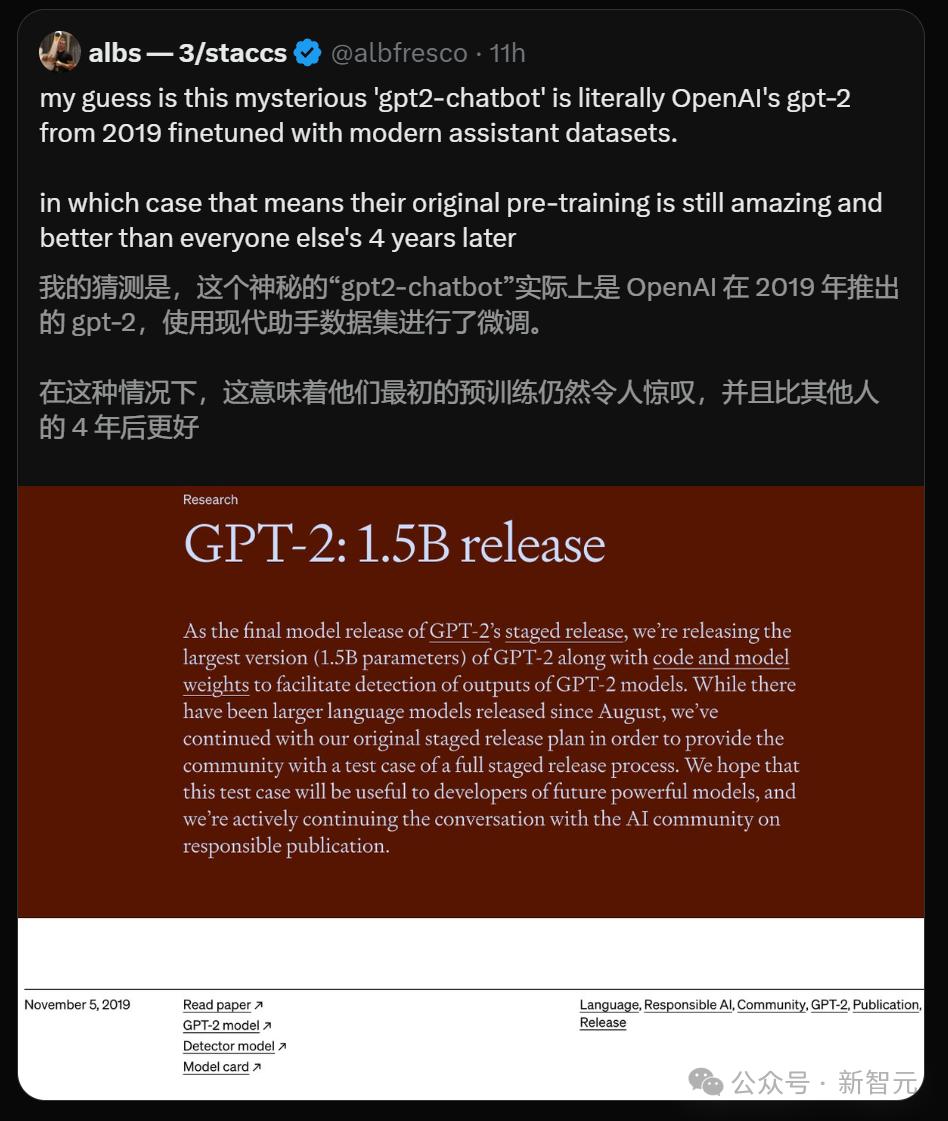 还有人猜测,gpt2-chatbot大概率是OpenAI在2019年推出的GPT-2,然后LMSYS使用现代辅助数据集对它进行了微调。
