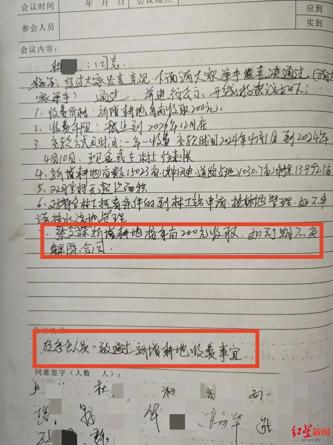 4月29日,红星新闻查阅了3月28日双胜村委会的“新增耕地会议记录”。会议提议:村内新增耕地按照每年每亩200元价格,收费年限至2026年12月,一年一收。