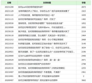 确实,大家在和导师相处时,往往会有诸多疑惑之处。但更令我疑惑的是:我后台随便一搜导师关键词,就有高达十三页的推送,涉及回复导师微信、应对导师查岗、push导师、开组会、写论文、刷脸等诸多实用场景。直接和导师相关的文章篇数有20篇,共计44356个字,阅读量大几百万啊!同学们明明很爱看啊!