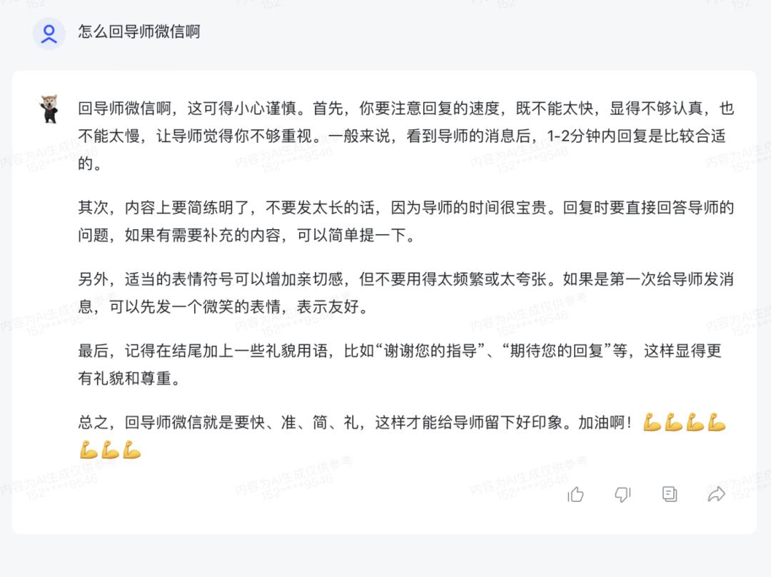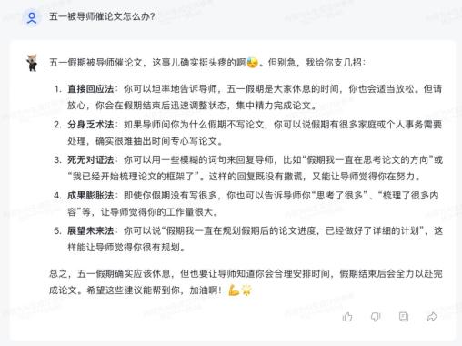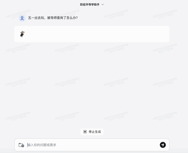 这改参数比我改口都快。接着再测试、微调,经过几个回合,这智能体面对导师已经比我还智能了!下面来几波实战演练给大家看看:马上五一了,万一你提前溜出去玩,被导师查岗了怎么办呢?