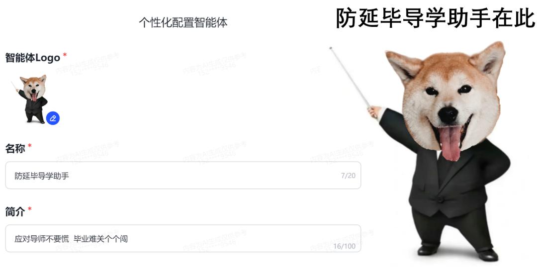 【第一步 起名、换头像、写简介】起名我先想了半个小时。这个应对导师的AI模型叫啥,我想了好多:读博多年大师兄、导师开心器、导师乐、导师闯关助手、对师宝典...最后我决定叫:【防延毕导学助手】,有防止大家延毕、指导学业进步的寓意。