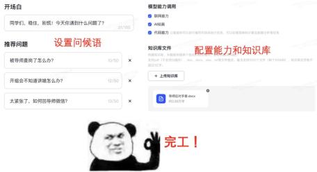 其实到这里智能体基本就完成了。还有个知识库功能,相当给智能体再补补课,我直接把之前写的导师文章一波投喂进去。最后加句开场白和推荐问题,就完成了!