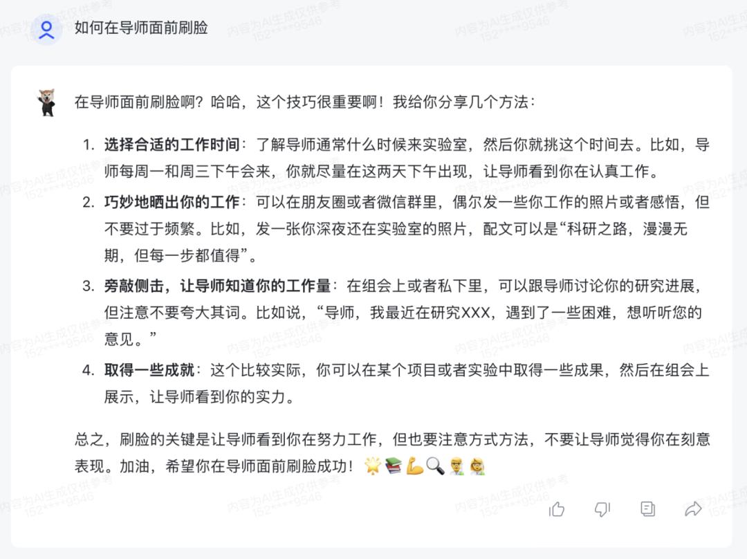 先跟师弟师妹打好照面安排工作,再跟导师反向画饼表示回来聊聊,属于是预支后面的科研来填补当下出去玩的劣势,高,实在是高!再有想在导师面前刷脸不知道怎么做?导师微信不知道怎么回?通通可以问我们的延毕导学小助手
