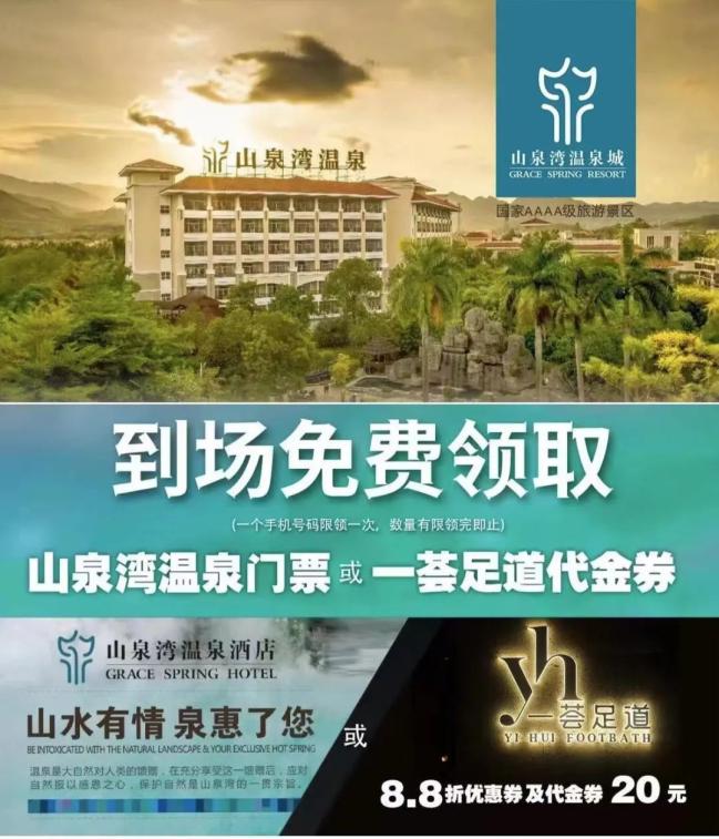 线上报名领“五一”车展门票,还能领取山泉湾温泉门票一张或一荟足道代金券1张。由于温泉门票及代金券数量有限,线上领取到的市民,在展会期间请到现场组委会处领取实物票,先到先得!
