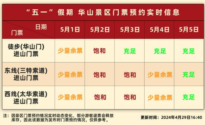 华山景区4月29日发布公告称,截至4月29日16:40时,华山景区5月2日各线路预约人数已达上限,5月3日乘索进山线路也已饱和。