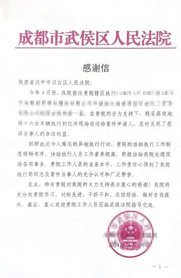 汉台区法院始终坚持全国法院“一盘棋”思想,强化执行协作意识,积极配合兄弟法院开展异地执行工作。武侯区法院的这封感谢信既是对该院执行工作的肯定,也展现了兄弟法院联手实现“切实解决执行难”的坚定决心!