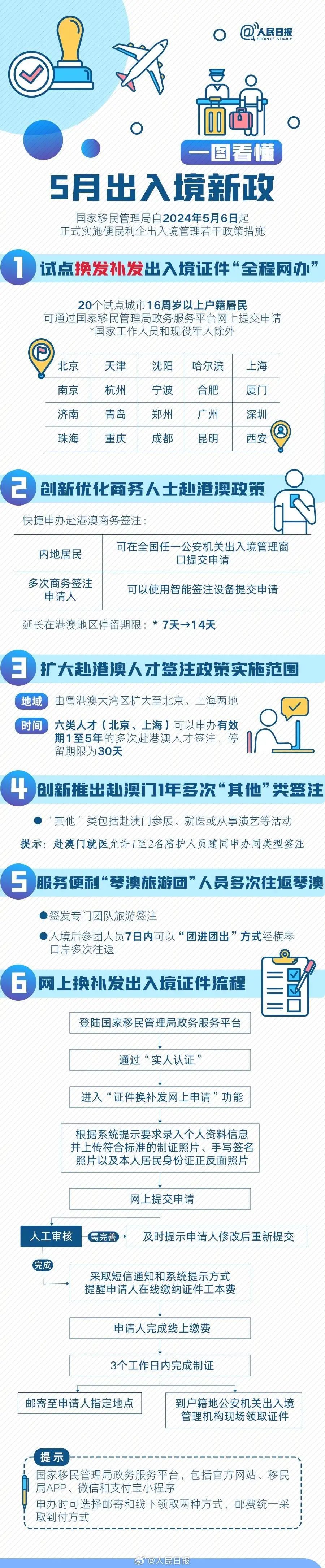 换发补发出入境证件 天津试点“全程网办”自5月6日起,在北京、天津等20个城市试点实行换发补发出入境证件“全程网办”。16周岁以上户籍居民,除登记备案的国家工作人员和现役军人外,只要曾经申领过普通护照、往来港澳通行证、往来台湾通行证且仍在有效期内,可以通过国家移民管理局政务服务平台网上申请换发补发同类证件,实现“一次都不跑”。