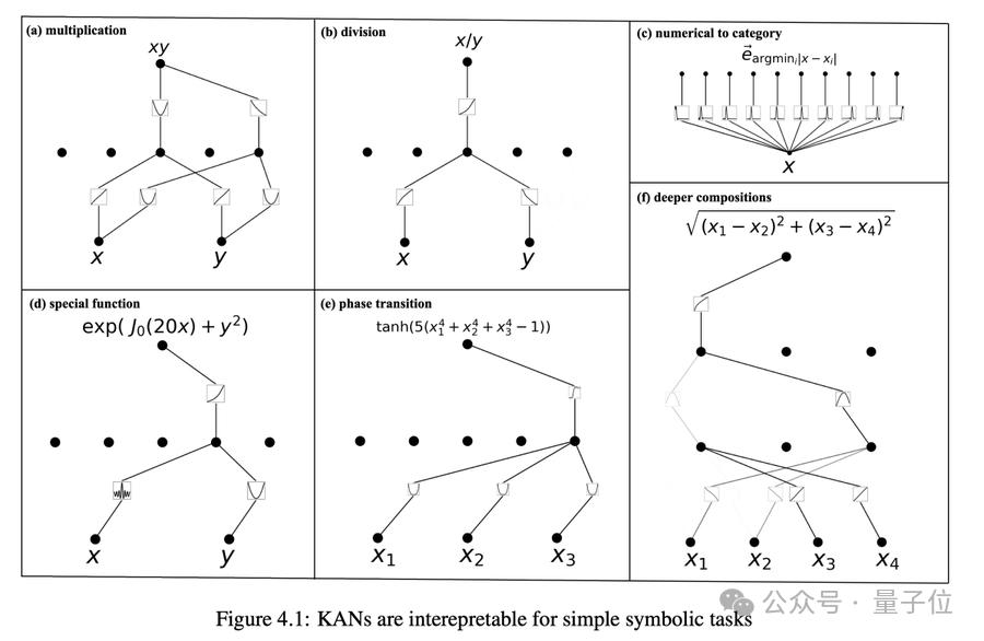 在可解释方面,KAN能通过符号公式揭示合成数据集的组成结构和变量依赖性。